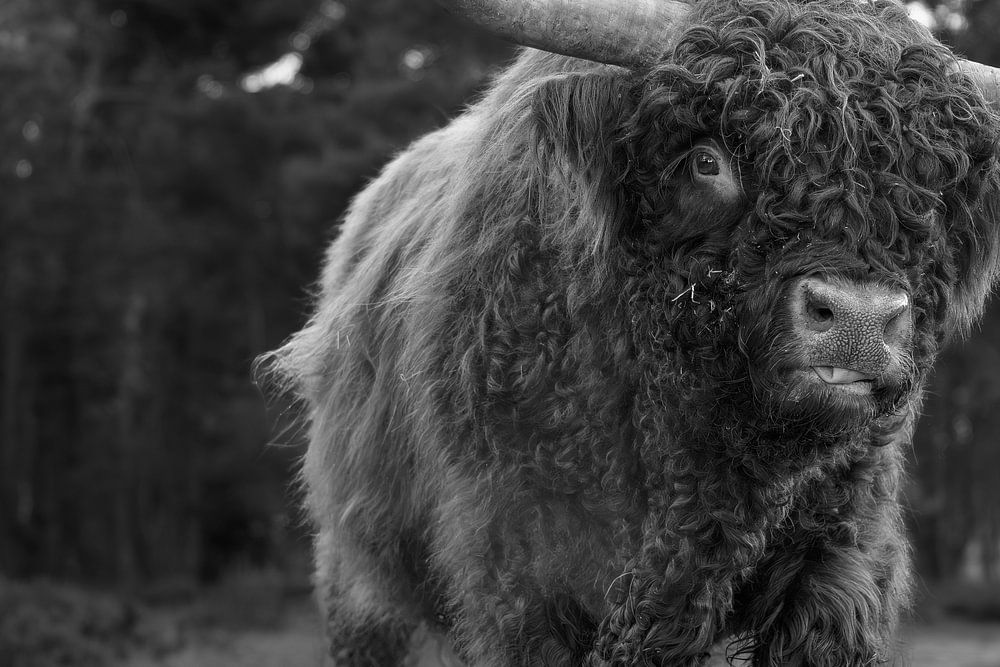 On the Wezepsche Heide stands this Scottish Highlander bull in pure form. Without colour, only the essentials remain: strength, texture and character. His huge stature and shaggy coat with great curls stand out sharply against the landscape, as if he has always been there.