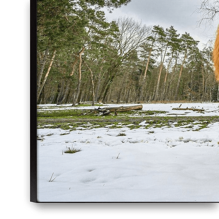 Portrait of a Scottish Highland cattle in the snow during an early springtime day in a forest. The Scottish Highlanders are used in the nature conservation of the Veluwe to ensure that heather areas do not grow densely.