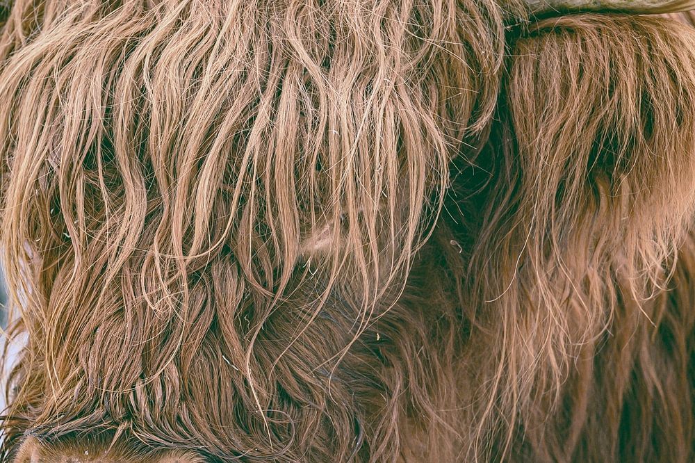 Portrait of a Scottish Highland cattle in the snow during winter. The Scottish Highlanders are used in the nature conservation of the Veluwe to ensure that heather areas do not grow densely.