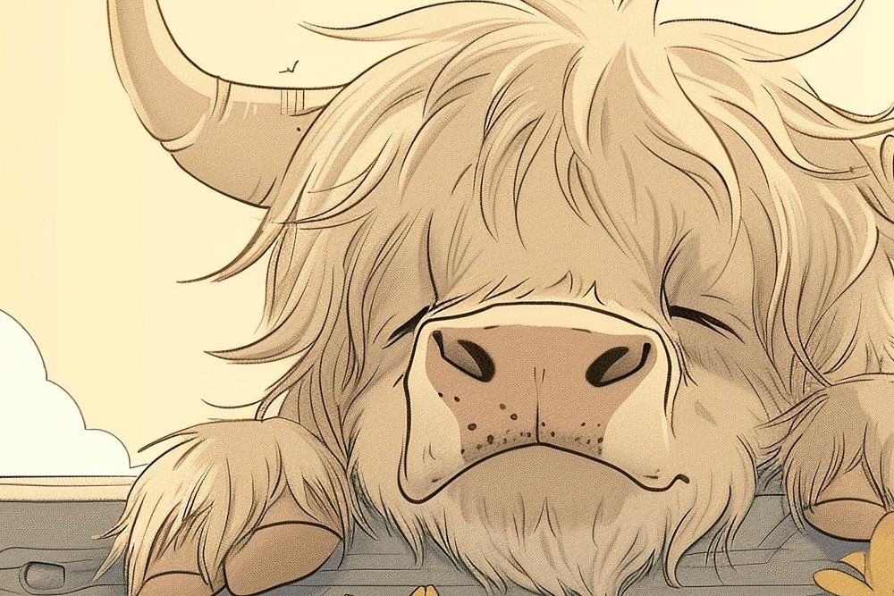 This cartoon-style illustration of a Scottish Highlander in deep sleep fits perfectly in any cute nursery.