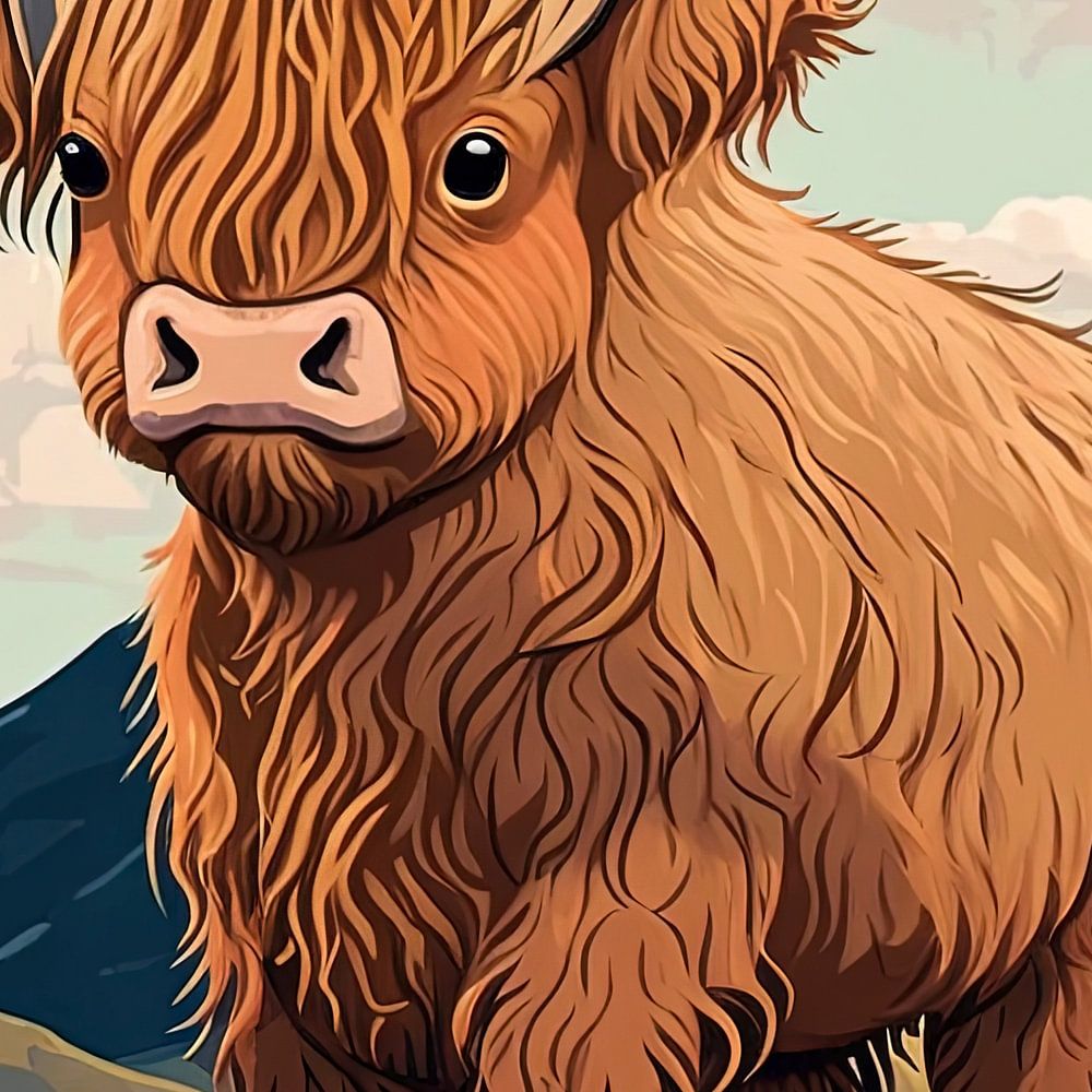 A cartoon of a Scottish Highlander. The Scottish Highlander is depicted with a puzzled look. Its fur is fluffy and woolly, with long hairs standing in all directions and sometimes tangled. Her horns are large and curved, with shades.