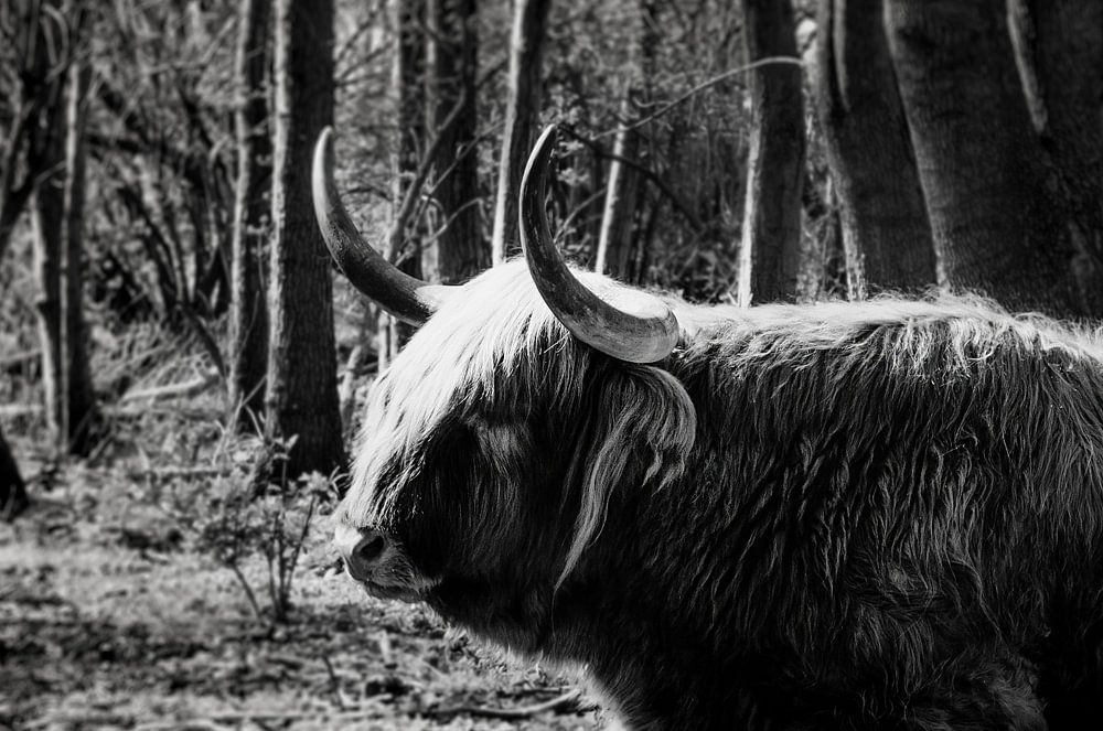 Black-and-white photograph of a Scottish Highlander (also known as Highland Cows) resting in the Low Mountain Forest.