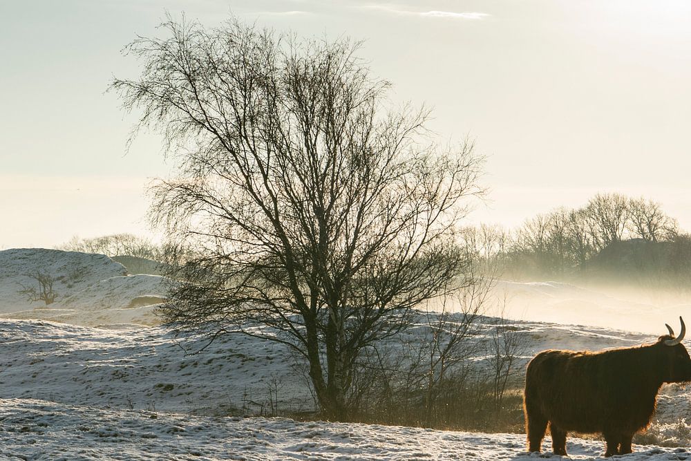 Scottish Highlanders in the Zeepeduinen in Zeeland with snow