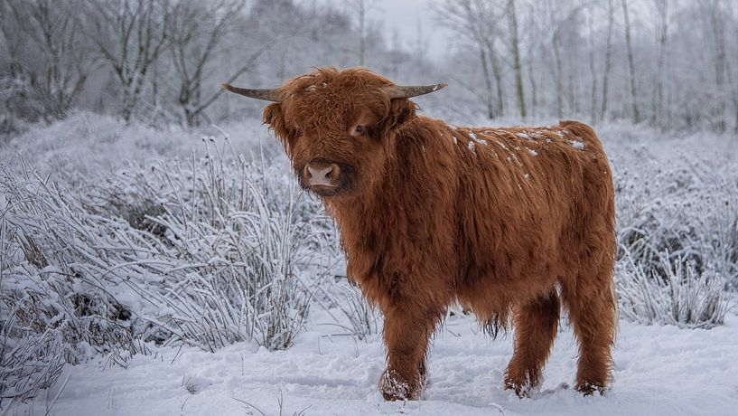 A young Scottish Highlander, judging by his horns still only an adolescent, stands in a snowy landscape. It has just snowed because the snow is still on his back. With its thick winter coat, it is not bothered by the cold, it actually likes the temperature. This animal is part of a large herd of Scottish Highlanders in a nature reserve…