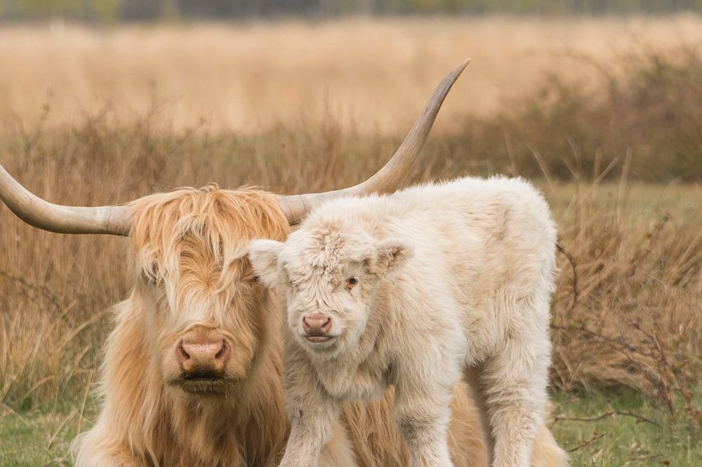 A blond Scottish Highlander, with a blond calf, in a meadow in nature reserve Huis ter Heide in De Moer in the Netherlands. The area is managed by Natuurmonumenten.