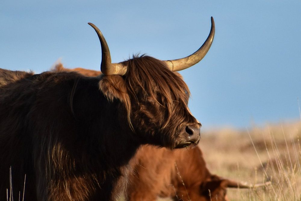 This Scottish highlander was walking peacefully across the Terlet heath as the sun was almost setting. With a blue sky over the Veluwe, this dark brown Scottish highlander was posing beautifully.
