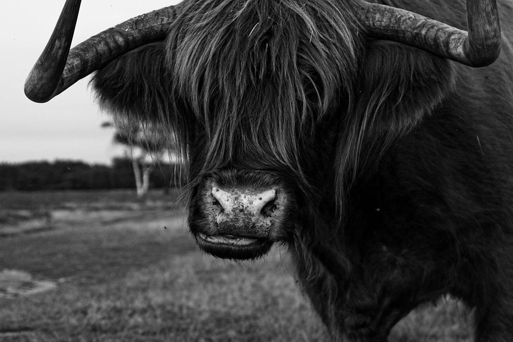 A black and white photograph of a Scottish highlander. These animals are very impressive and have a lot of power. I took the photo in a nature reserve near Hilversum.