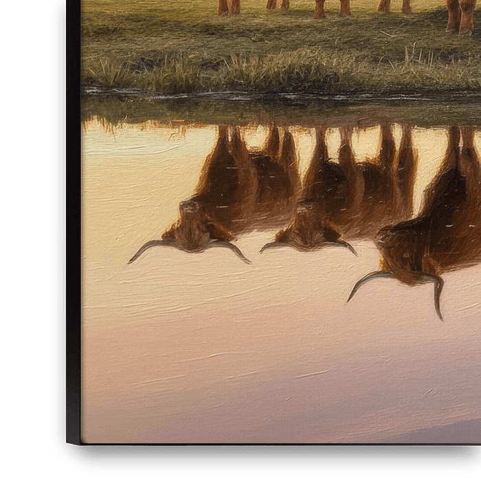A tranquil image of Scottish Highlanders in the evening light, with their reflection in the water. The piece brings a natural, rural feel to the home and fits well in both modern and rustic interiors. Ideal as timeless wall decoration for those who love simplicity and the outdoors. In oil paint look