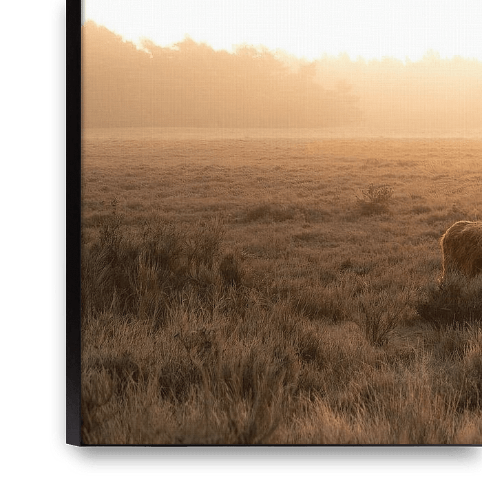 Buy this landscape artwork Scottish Highlanders at sunrise | The Netherlands by Marika Huisman fotografie on canvas, ArtFrame, poster and wallpaper, printed on demand in high quality.