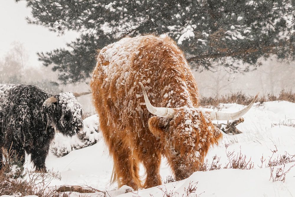 Scottish Highlanders covered in ice and snow. Nature reserve the Deelerwoud at the Veluwe in the Netherlands. White world in a winter landscape. Sturdy and penetrating portrait of robust Scottish Highlanders grazing the heathlands in the Deelerwoud.
