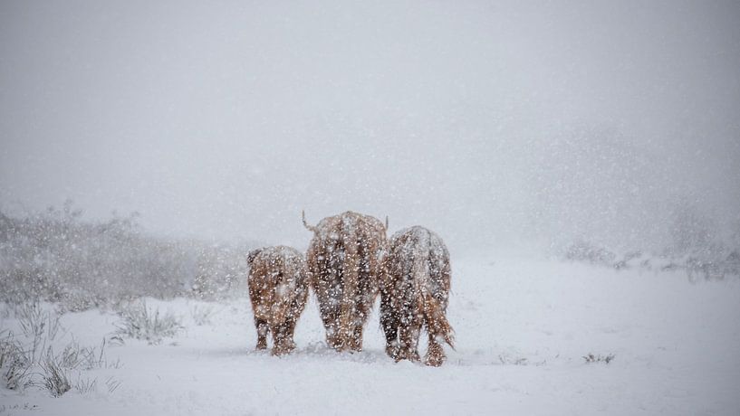 Three Scottish highlanders walk in a snowy landscape during a heavy snowfall. They are already partly white from the snow but they can withstand the cold well due to their thick coat of long hair, this temperature is ideal for these animals. On the road together, the herd is very close, they take good care of each other, they are calm…