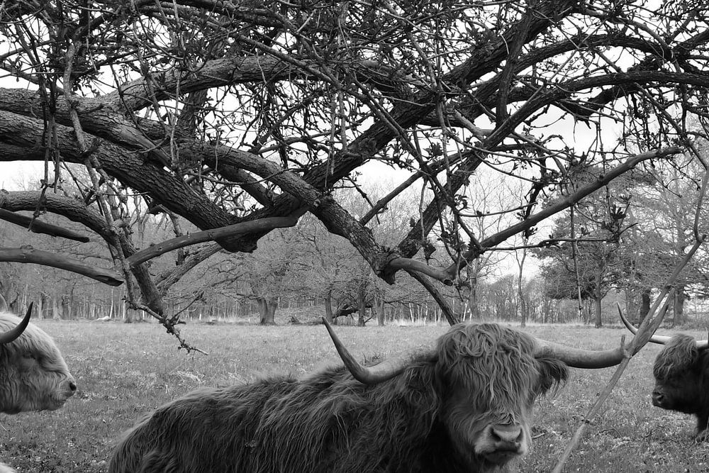 Scottish Highlanders at rest framed by the branches of a fallen tree near Oudemolen