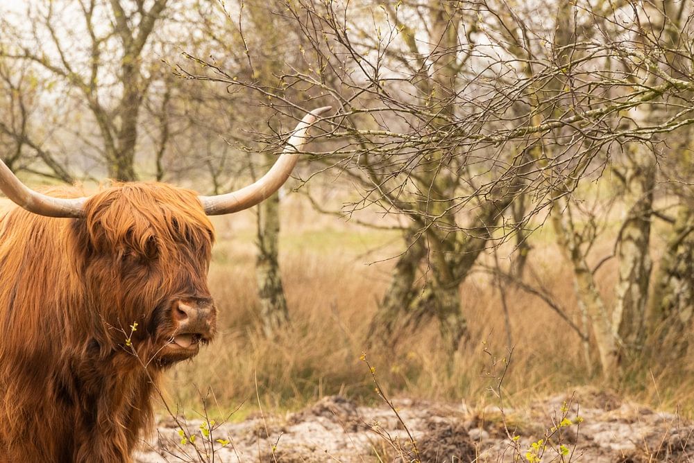 Scottish highlander at Westerschouwen forestry. At the Zeepeduinen by the forest. A breed of cattle originally from Scotland. Here in this area, several graze together. They are usually reddish-brown and have long hair and long horns.