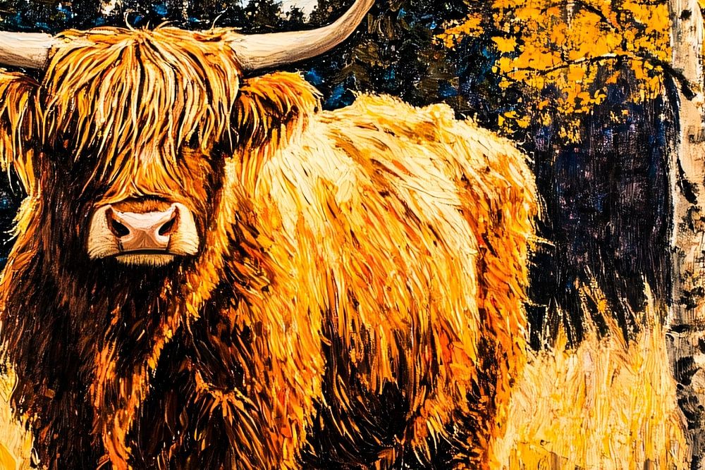 This painting beautifully brings to life the strength and serenity of a Scottish Highlander. The imposing animal with its golden-brown fur takes centre stage in an autumn landscape, surrounded by a forest of slender trees with yellow-coloured leaves. The painting's warm colours and texture make this artwork a perfect choice for lovers of nature and rustic beauty. An eye-catcher in any room!