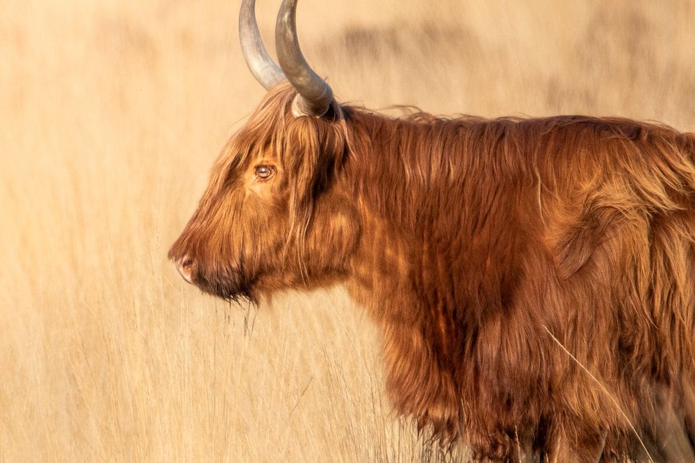 Buy this highland cow art Scottish highlander in evening light by Roy Kreeftenberg on canvas, ArtFrame, poster and wallpaper, printed on demand in high quality.
