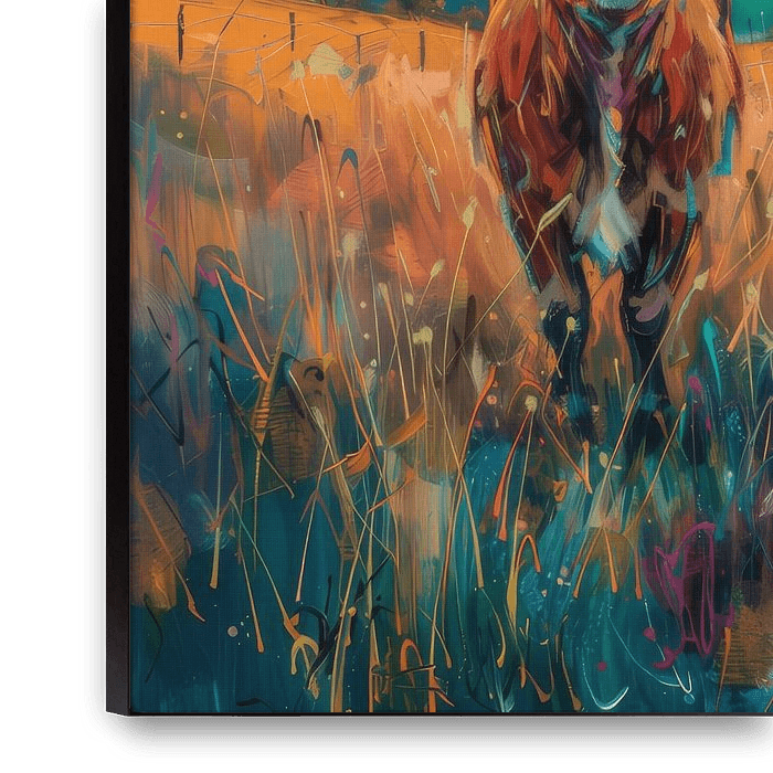 This breathtaking artwork shows a Scottish Highlander in a brightly coloured, abstract rendering of a sunset. The sky is filled with dynamic brushstrokes of pink, orange, and blue, creating a surreal atmosphere. The field in which the Highlander stands is illuminated by the sun's last rays, accentuating the warm hues of the grassland.…