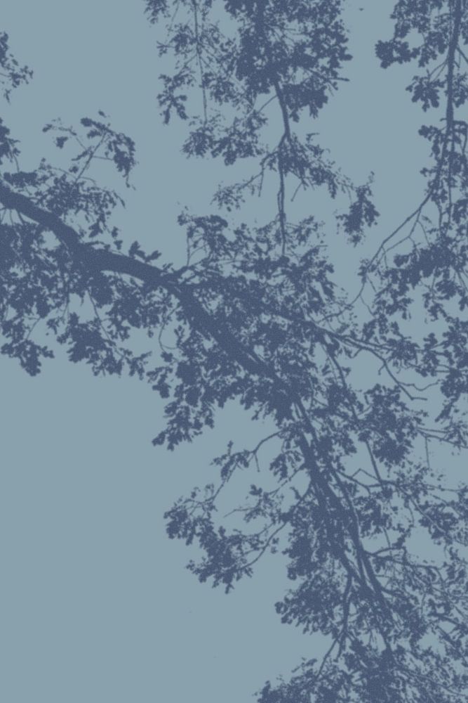 This image shows a silhouette of an oak branch against a light background. The composition was created using one of my photos's and has a minimalist and graphic look, with the branches and leaves as dark shapes contrasting with the plain background. The colours are limited to a light blue shade for the background and a dark blue shade for the branches, creating a vintage or silkscreen aesthetic. The delicate details of the leaves and twigs give the work a natural dynamic, while the simplified colours evoke an abstract and timeless atmosphere.