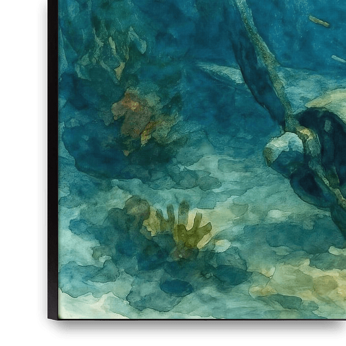 This watercolour painting transports you to a silent world full of stories from the past. Amid calm ocean calm lies an old plane wreck, half overgrown with coral and seaweed. A curious diver floats past it, surrounded by colourful schools of fish that have now embraced the wreck as their home.