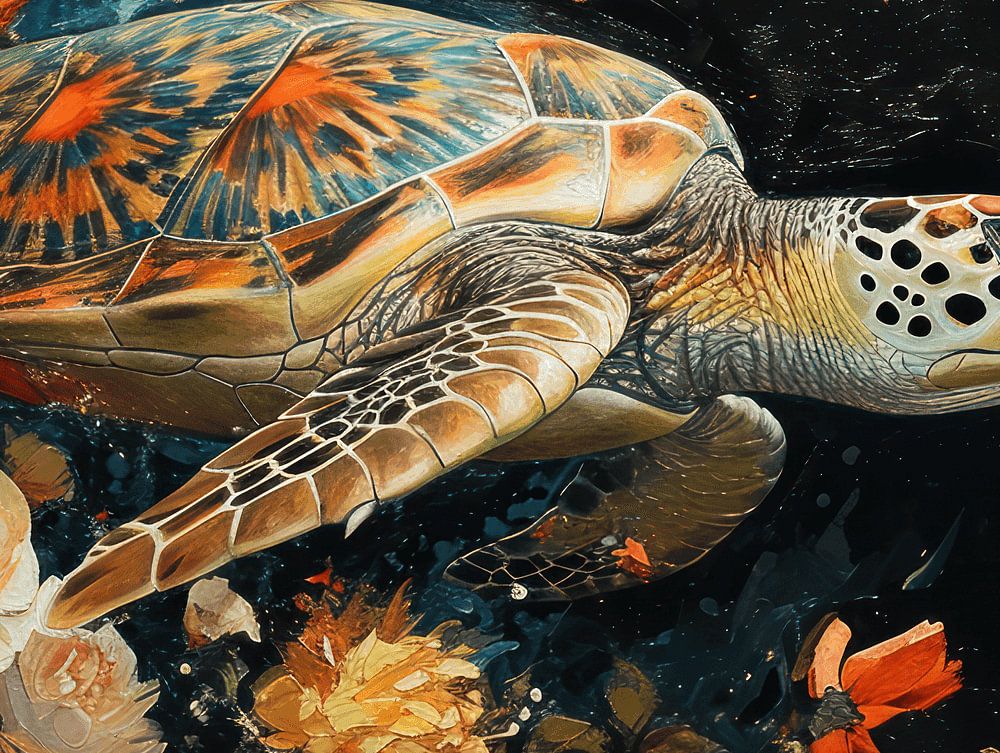 "Sea Turtle Oasis" is a picture-perfect artwork depicting the wonderful harmony between maritime life and flowering flora. A graceful sea turtle swims through the canvas, surrounded by an explosion of colour, with flowers that seem to dance in the underwater current. The turtle, with its beautifully drawn shell and peaceful expression, transports the viewer to a world where nature in all its forms is in balance. The brush strokes are both dynamic and detailed, creating vibrant texture and depth. This piece of art would be a serene yet vibrant addition to any space, ideal for those seeking a connection to the natural world beneath the sea.