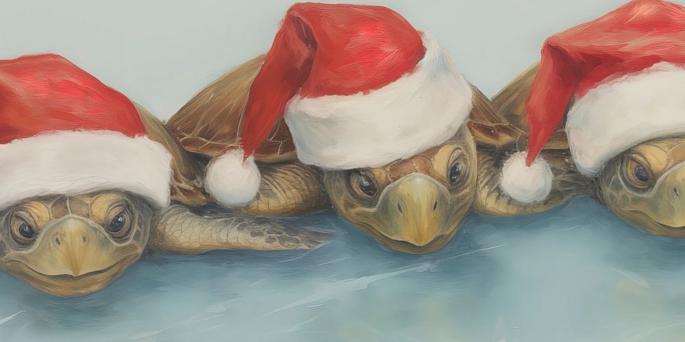 Three sea turtles wearing Santa hats. The pastel colours and low contrast create a serene look. Bring the cosiness of Christmas into your home with this charming piece!
