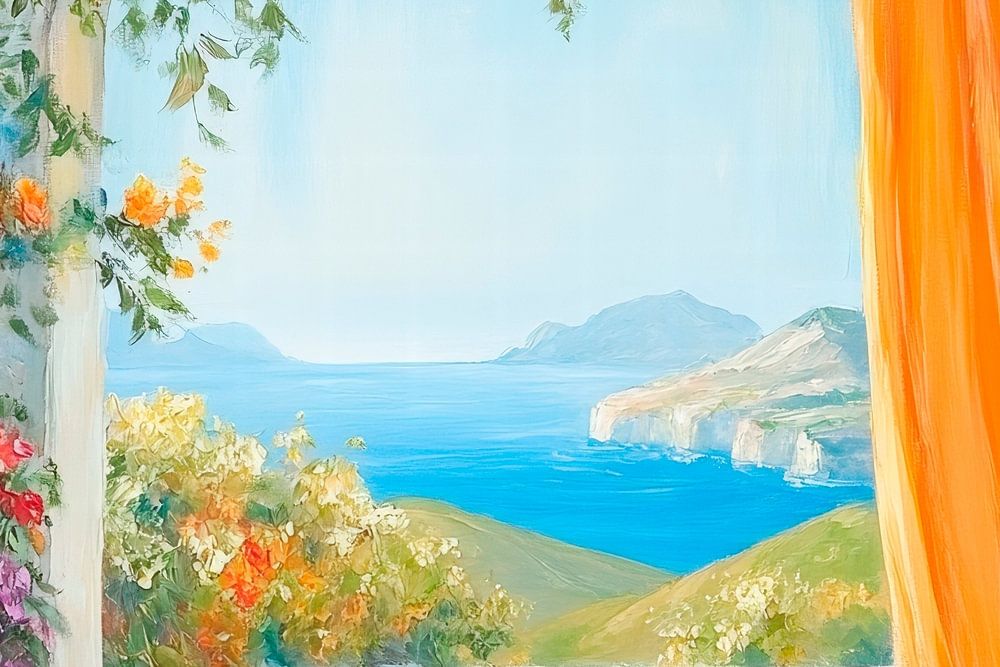 A sun-drenched terrace invites you outside, surrounded by bright flowering plants and a soft orange curtain. The view of the glistening sea and rolling hills conveys a feeling of holiday and relaxation. This work of art lends every living room a dreamlike atmosphere that invites you to linger and dream.