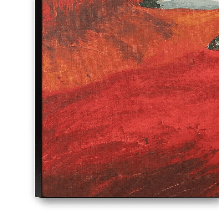 Print of a painting made with acrylic paint. The coast of Crete painted with palette knife and rough strokes. The mountains orange and red against a purple sky.
