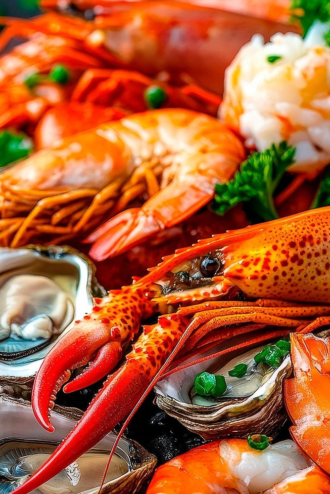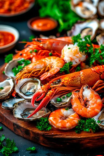 A festive centrepiece for gourmets and friends! Rich seafood, skilfully arranged on a rustic wooden board, attracts everyone's attention. Vibrant colours and fresh ingredients bring an inviting atmosphere to any kitchen or stylish dining room. This arrangement promises culinary delights and convivial evenings!