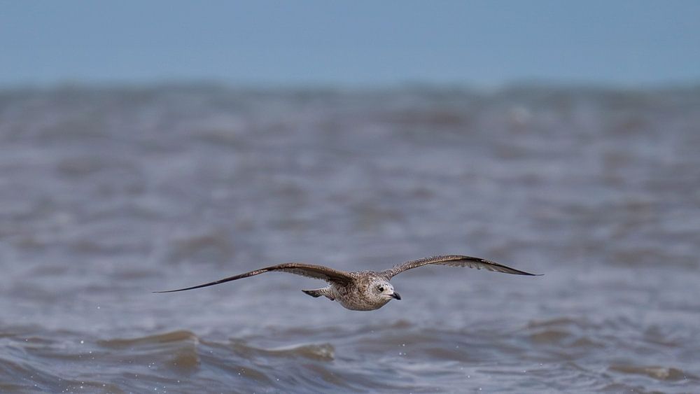 A seagull flies towards the beach above the surf of the North Sea. The bird is brought into sharp focus. This work can be ordered in both colour and black and white.