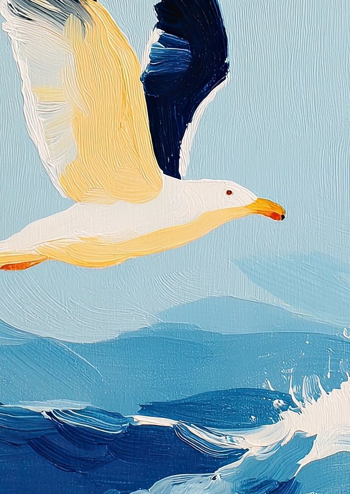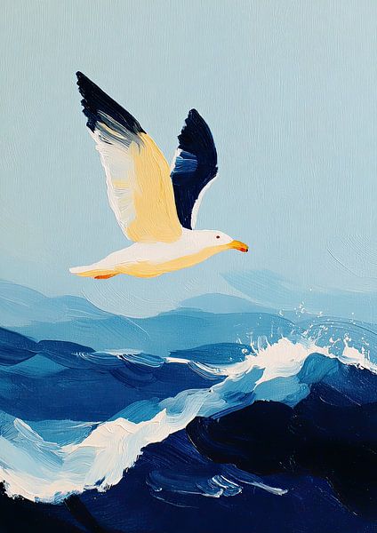 This impressionist painting depicts a white seagull in flight against a light blue sky. The bird captivates with its yellow accents on the underside of its wings and orange beak. With its wings spread wide, it hovers above a dark blue, textured sea, whose waves appear lively thanks to dynamic brushstrokes and white splashes of paint. In…