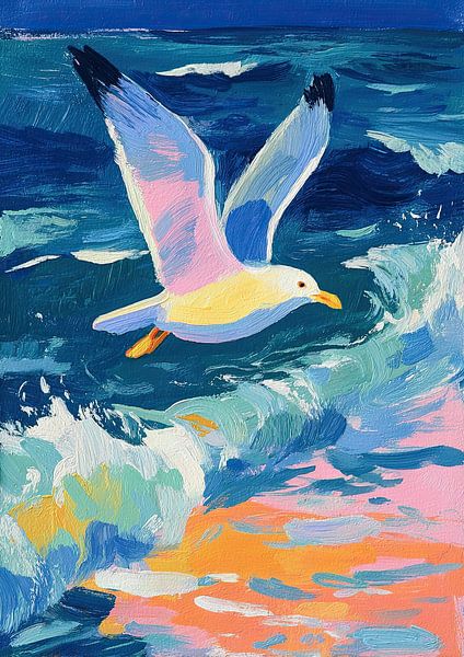 This vertically oriented, impressionistic painting depicts a seagull in profile above a turbulent seascape. The bird's body is rendered in white and pale yellow, while its widely spread wings feature delicate shades of pink and light blue. Below it, the ocean breaks into bold brushstrokes of deep blue and turquoise. The lower part of…