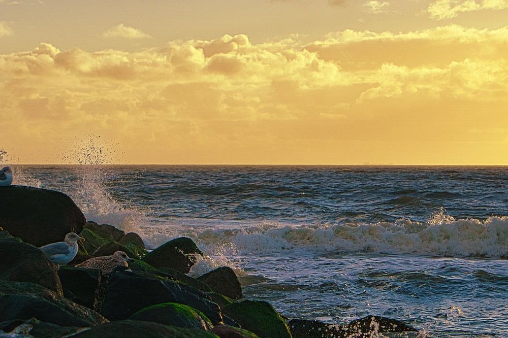 Seagulls in the sunset on the beach of Blåvand. The sun shines on the sea