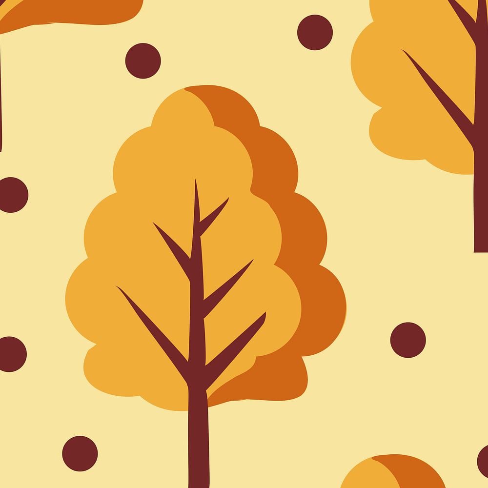A seamless repeating pattern featuring stylized autumn trees in warm fall tones. Designed with a clean flat illustration style, soft yellow background, and earthy orange and brown colors.