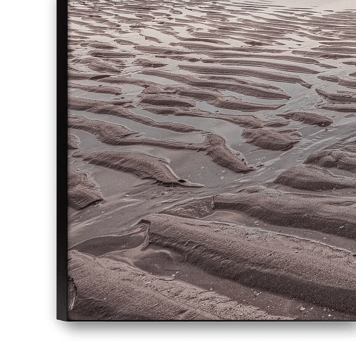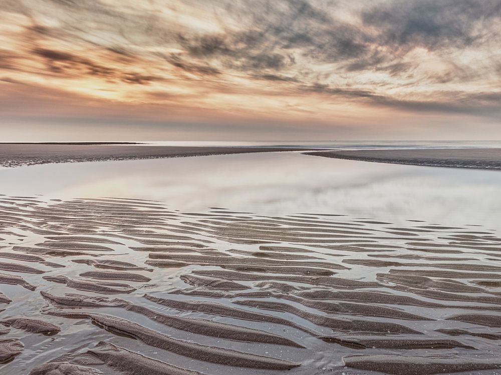Here an atmospheric wide and modern seascape. The Dutch coast with a view of the beach the North Sea at sunset. A long shutter speed makes it digital art. ( long exposure ). The digital coastline of the Dutch coast during low tide. In the foreground special shapes and patterns in the sand. Also a beautiful reflection of the clouds on the still seawater.