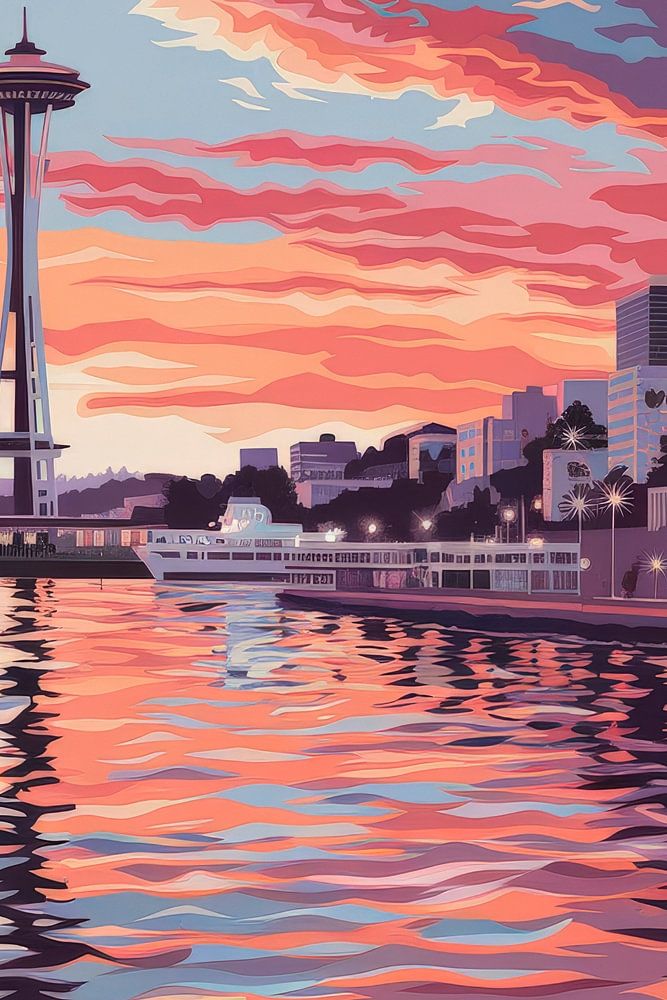 A vibrant image that captures the majestic Seattle skyline as soft, pastel-coloured clouds reflect over the glistening water. The iconic Space Needle rises proudly amidst this picturesque scene. Ideal for the living room, it brings a creative and relaxed atmosphere that invites you to dream and linger.