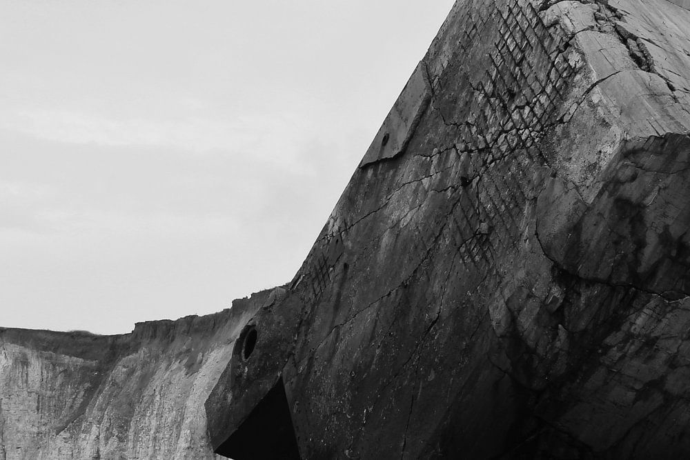 The striking chalk coastline near Quiberville, in Normandy, France. The area has heavily eroded cliffs and derelict German WW2 concrete bunkers. The bunker photographed here has slipped dramatically onto the beach, and now stands on end, reaching many meters in the air, quite an unusual sight.
