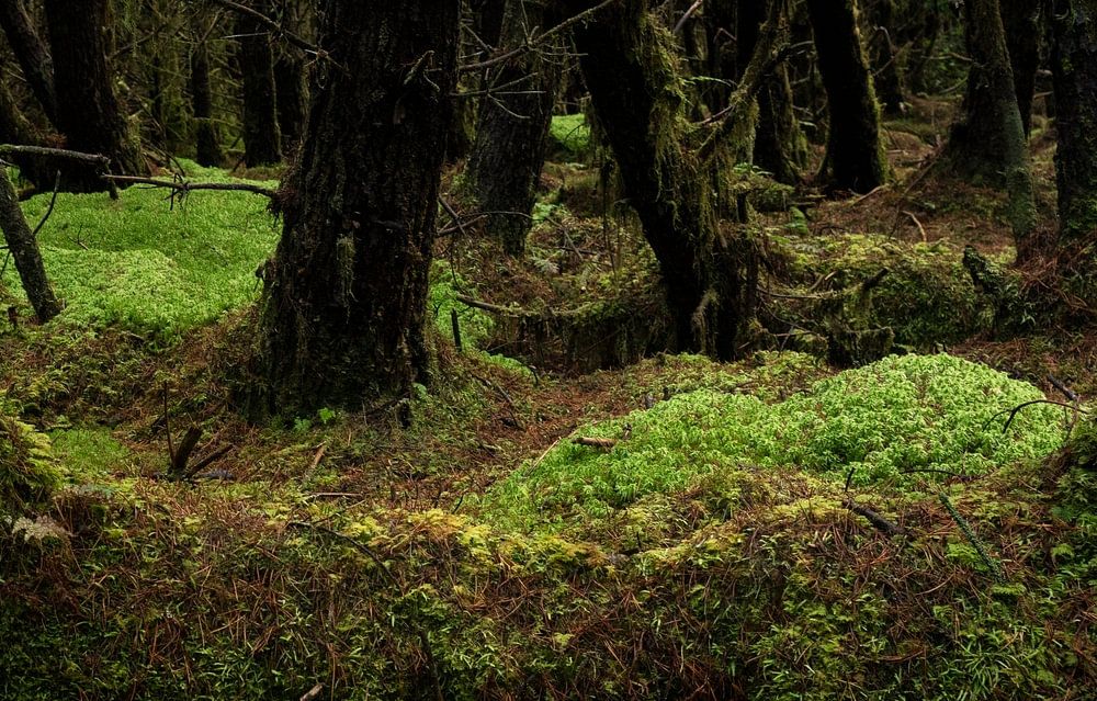 Secretive fairytale forest in Ireland. The ground is covered with fresh green moss.