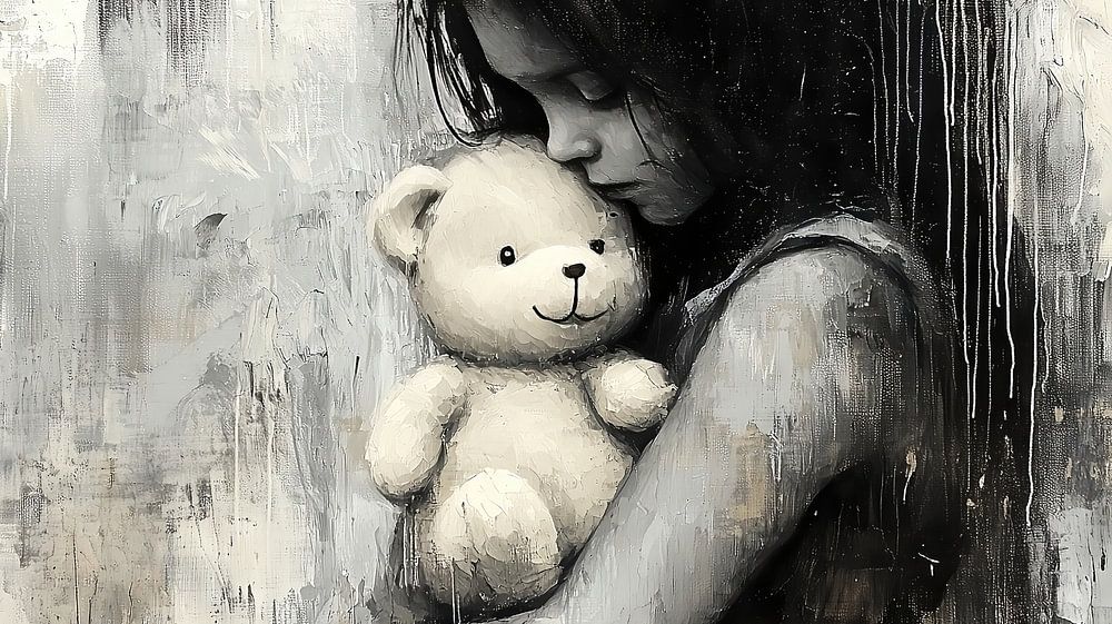 Painting of a young girl hugging a teddy bear, conveying a sense of comfort and security in the midst of uncertainty. The textured background adds depth and a contemporary feel to the painting, expressing the girl's emotional attachment.