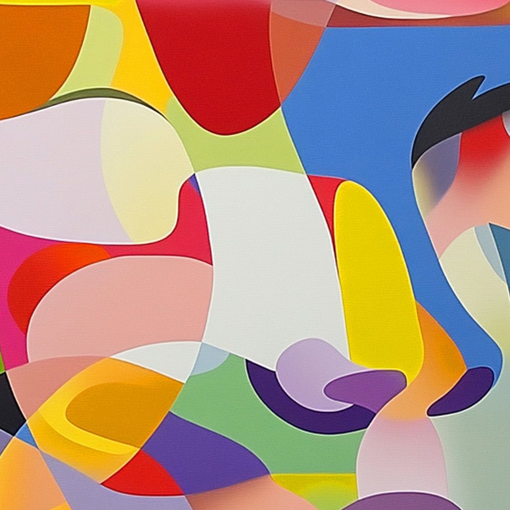 This colourful portrait is composed of abstract, flowing shapes that intertwine like puzzle pieces. Bright colours such as red, yellow, blue, purple and green combine to form a face - or rather, a gaze. One eye looks straight at you, sharp and striking among the wavy planes. As if saying, "I see you. Really."