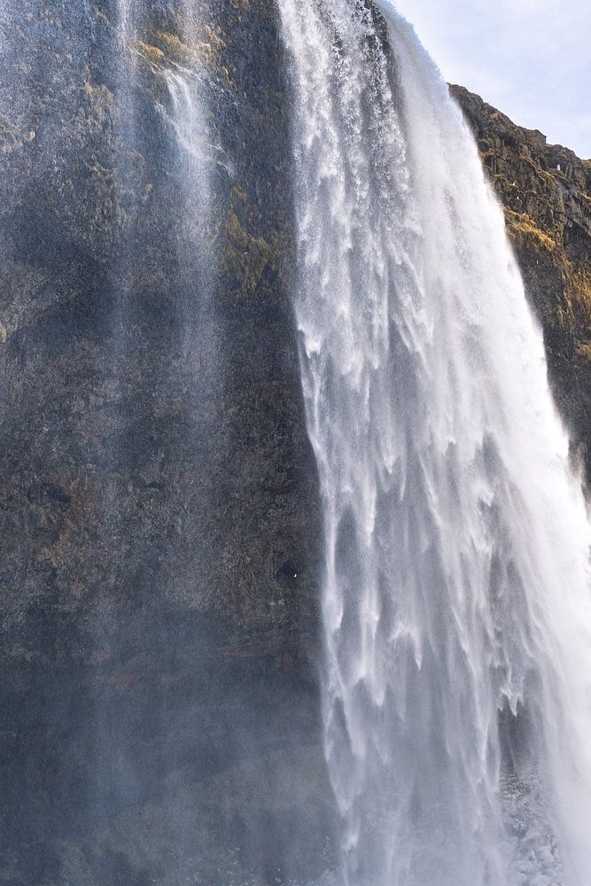 Seljalandsfoss in Iceland during a cloudy spring day. Where the water falls down with a loud thunder. With yellow moss and blue water for a color contrast, and dark surroundings with light colored waterfall for light contrast.