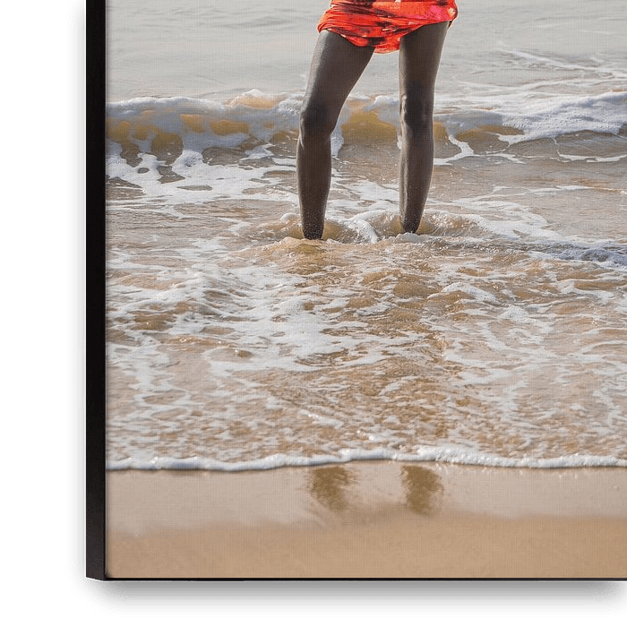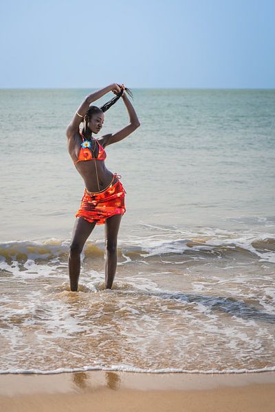In this picture, the pure joie de vivre of the Senegalese coast comes alive. We see a young woman who, with her feet in the shallow water, seems to become one with the rhythmic surf of the sea. The contrast in this image is breathtaking: the bright, cheerful colour palette of her swimming costume stands out sharply and beautifully…