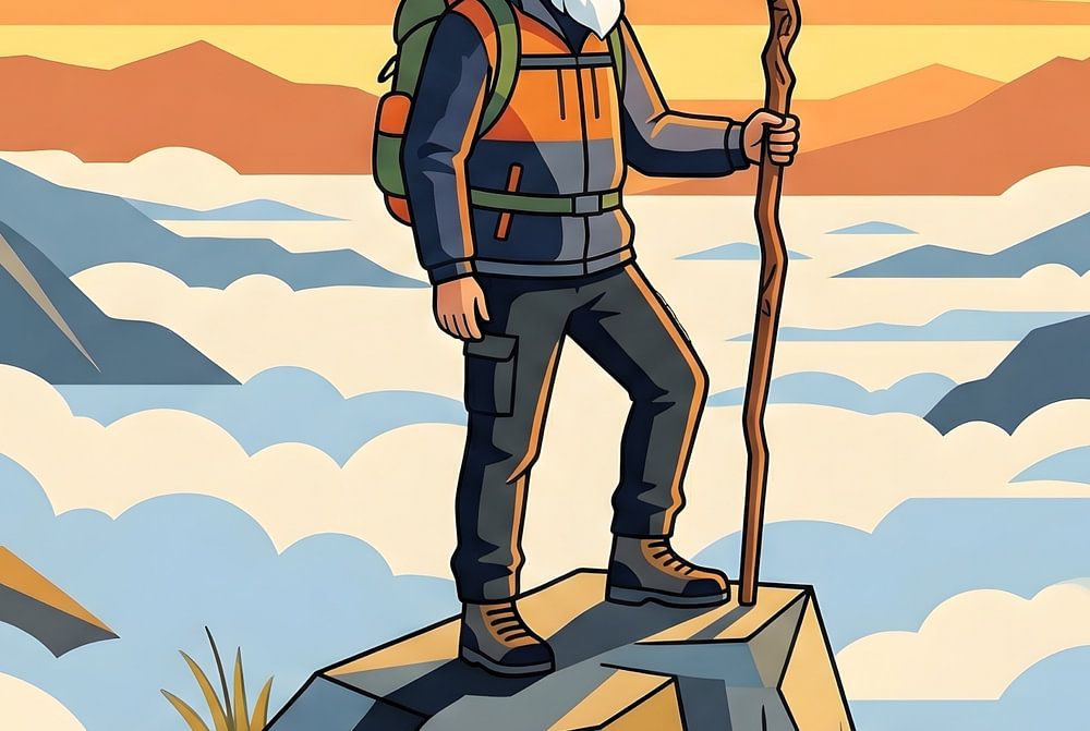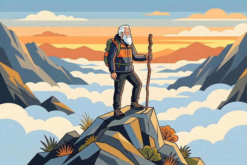 This vibrant vector-style illustration captures an elderly, white-bearded mountaineer standing triumphantly atop a jagged peak, leaning on a rustic wooden staff. The artist employs a sophisticated palette of warm ochres, deep navy, and soft cerulean to depict a sea of clouds that separates the hiker from the distant, rhythmic mountain…