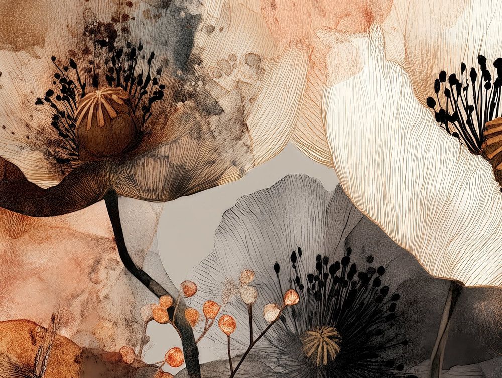 A serene botanical artwork where muted petals drift between watercolor and memory. Warm amber tones blend with smoky greys, creating a sense of quiet nostalgia and timeless grace — nature rendered in whispers and light