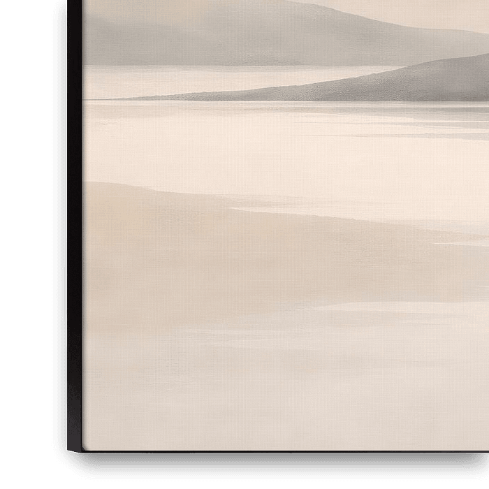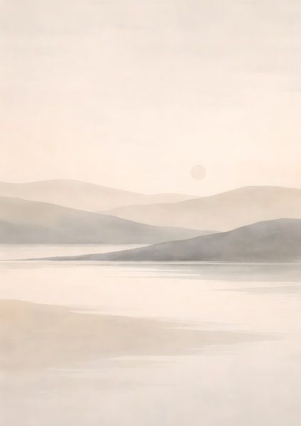 Calm minimalist landscape artwork featuring soft layered hills, gentle water reflections, and warm neutral tones. The airy composition creates a peaceful, meditative atmosphere, ideal for Japandi, Scandinavian, and modern minimalist interiors.