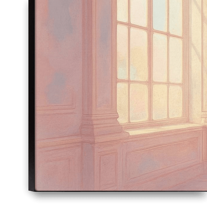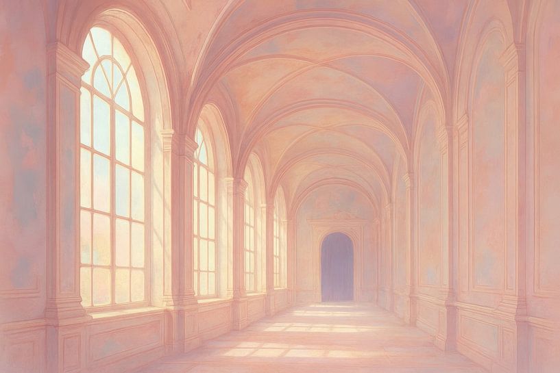 A long, classical arcade with high arches stretches towards a dark door, while soft morning light pours in through slender windows. The rhythmic repetition of the arches and the long perspective create tranquillity and depth. Subtle pastel tones mix with warm shadows, creating a dreamy, almost misty atmosphere. Two distinct elements…