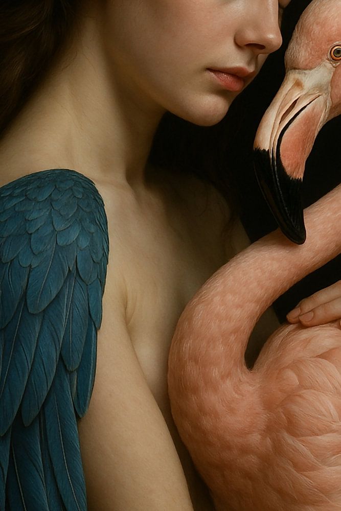 A serene woman embracing a flamingo. The soft, classic look combined with the subtle colours and sophisticated details creates a dreamy atmosphere that feels both modern and timeless.