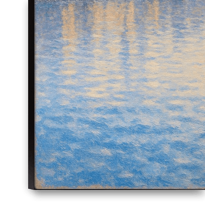 A soft hush lingers over the frozen calm of Évian, where water and sky dissolve into one another in tones of pearl, lavender, and pale blue. Inspired by Claude Monet’s mastery of reflection and atmosphere, this painting captures the delicate dialogue between lake and light. The faint silhouettes of towers and trees drift like memories…