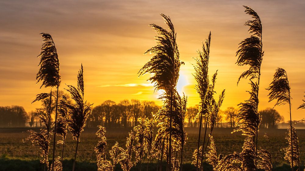 On the picture you can see a beautiful setting sun, which causes a very nice golden yellow glow. In the foreground several plates can be seen.