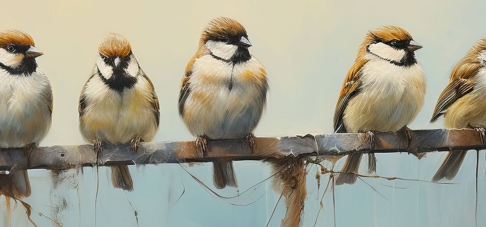 Seven Peaceful Sparrows - This painting enchants with a row of seven fluffy sparrows sitting peacefully on a weathered wooden beam. The birds are lifelike depicted against a soft blue background, which combines with the subtle earth tones of the wood to create a calm, natural atmosphere. The fine details such as the birds' soft plumage and sharp glances are striking, giving the scene a lively and heartwarming feel.