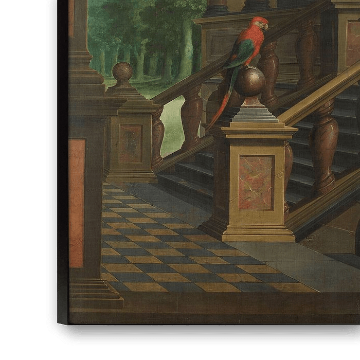 Seven-part room painting: An outdoor staircase, Dirck van Delen, 1630 - 1632 oil on canvas, h 309cm × w 124.5cm Part of a seven-part room painting in five pieces depicting an interior, two galleries and two outdoor staircases, populated with numerous people. This is the left half of the depiction of an outdoor staircase. A man and a woman look out of the window, on the balustrade of the staircase sits a parrot.