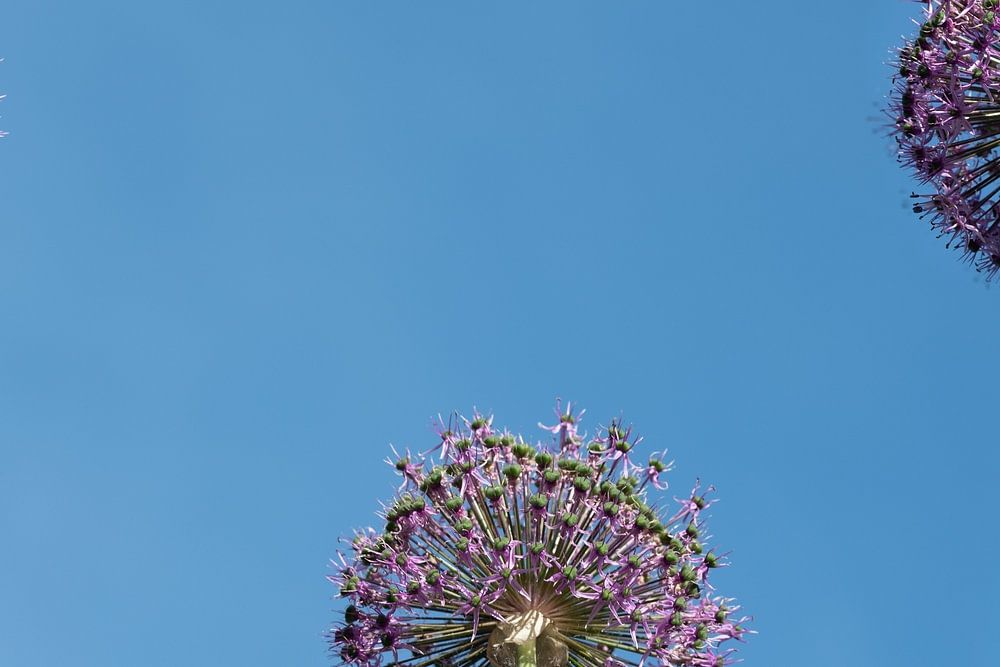 Several flowers of purple ornamental leeks grow against a blue sky. The flowers glow in the sun.